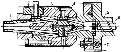 图10-3 有分流梭棒材机头的结构图 1-口模 2-分流梭 3-模体 4-支架 5挤出机 6-螺杆 7-多孔板 |