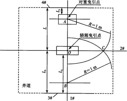 如图8.1-1所示,在轿厢中心线上选取AO=OB(两个曳引点的距离),然后分别以A、B为圆心,以R=1m为半径画弧,将两弧的交点C与轿厢曳引点O间用墨线弹出几条直线。如图8.1-1中的2#线。