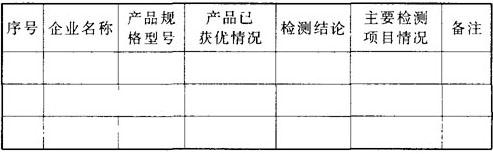 数据汇总表填表说明: 1.所有参加统检企业均应列在表内。 2.“产品已获优情况”要写明获优时间及获优级别(国、部、省(市)优) 3.“检测结论”要按“三级”分等结论填写。 4“主要检测项目及得分情况”栏只列出反映产品质量的主要检测项目,按以下原则进行选择:(1)对产品质量影响大的;(2)各企业的产品之间差距明显的;(3)总体水平较低的。 5.列出的主要检测项目应包括标准数据(指该产品达到质量等级的标准)和参评产品的实测数据,例如:噪声“优等*×db,实测××db,可靠性:合格品××小时,实测××小时”等、不合格项应标明 附表五(1)(样表) 一九九 年机械产品质量统检结果计算机输入表 检测单位名称: