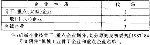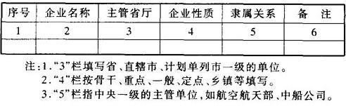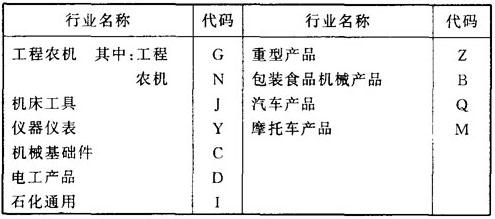 填表说明: 1.是否发证,要注明是生产许可证还是认证。 2.省市码、企业码和行业码的编法见附表五(2)、五(3)、五(4)。 附表五(2) 各省、自治区、直辖市、计划单列市机械厅(局)的代码表 代码 各省、自治区、直辖市、计划单列市机械厅局 01 北京市机械局 02 北京市仪器仪表公司 03 北京市农机工业公司 04 天津市机械局 05 天津市电子仪表局 06 河北省机械电子厅 07 山西省机械厅 08 内蒙古自治区冶金机械厅 09 辽宁省机械工业厅 10 大连市机械局 11 吉林省机械电子厅 12 黑龙江省机械工业厅 13 上海市机电局 14 上海市仪表电讯局 15 上海市郊县工业局 16 江苏省机械厅 17 浙江省机械厅 18 宁波市机械局 19 安徽省机械厅 20 福建省机械厅 21 厦门机械冶金工业局 22 江西省机械厅 23 山东省机械厅 24 青岛市机械局 25 河南省机械电子厅 26 湖北省机械厅 27 湖南省机械厅 28 广东省机械厅 29 海南省机械工业总公司 30 广西自治区机械厅 31 四川省机械厅 32 重庆市机械局 33 贵州省机械厅 34 云南省机械厅 35 陕西省机械厅 36 甘肃省机械总公司 37 青海省机械厅 38 宁夏自治区重工业厅 39 新疆自治区机械电子厅 40 西藏自治区工业电力厅 41 中国北方工业(集团)总公司 42 北京汽车工业公司 43 天津汽车工业公司 44 上海汽车拖拉机工业公司 45 金杯汽车股份有限公司 46 深圳经济发展局 附表五(3) 行业编码表