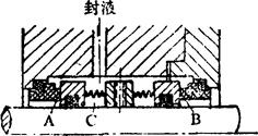 图3-5-46 双端面机械密封 2.内装式与外装式 弹簧置于工作介质中的为内装式,如图3-5-45;弹簧置于工作介质之外的为外装式,如图3-5-47。外装式的弹簧等零件不与介质接触,便于观察及维修;但这时介质的作用力与弹簧力相反,因此动静环摩擦面上的比压随介质压力的变动而有较大波动,当介质压力升高时,弹簧力的余量可能不够,因而引起密封泄漏;反之,当介质压力下降时,尤其在低压起动时,弹簧力又可能过大,而擦伤摩擦面。内装式密封则受力情况较好。一般只在下列情况下才采用外装式密封: