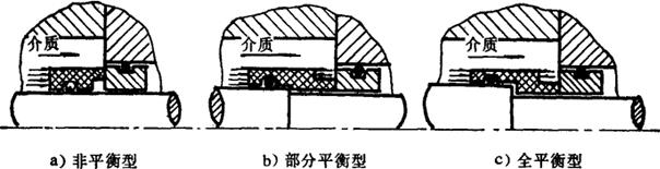 图3-5-47 外装式机械密封 (1)当密封零件、弹簧等的材料不耐介质腐蚀时; (2)介质易结晶或过于粘稠,影响弹簧性能时; (3)介质压力低时。 3.平衡型与非平衡型 根据介质压力在摩擦面上所引起的比压的卸载情况:不卸载的叫作非平衡型,见图3-5-48a;部分卸载的叫作部分平衡型,见图3-5-48b;全部卸载的叫作全部平衡型,见图3-5-48c。卸载多少根据具体情况由经验或试验来确定。卸载愈多,摩擦面上的比压愈小,可减轻端面的磨损;但摩擦面上的比压过小,密封接触面有被推开的危险,不能保证可靠的密封。