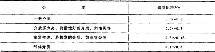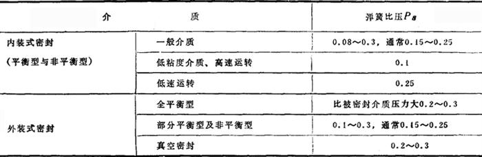 图3-5-48 平衡型与非平衡型机械密封 4.内流式与外流式 介质沿半径方向从外圆周向内泄漏的称为内流式,如图3-5-45;反之称外流式,如图3-5-47。内流式的泄漏方向与离心力方向相反,离心力可阻碍介质的泄漏,故泄漏量较小,尤其在有固体颗粒的情况下,采用内流式可防止固体颗粒进入摩擦面。同时,为了防止固体颗粒进入摩擦面,摩擦面不能倒角。 此外,根据弹簧是否随轴一道转动,可分为旋转式与静止式;根据机械密封采用的是单的大弹簧还是多个小弹簧,又可分为单弹簧式与多弹簧式等。 (二)机械密封的计算 1.端面比压与弹簧比压的选择 端面比压及弹簧比压的一般数值,可参照表3-5-62、3-5-63进行选择。 表3-5-62 端面比压的一般数值(MPa)