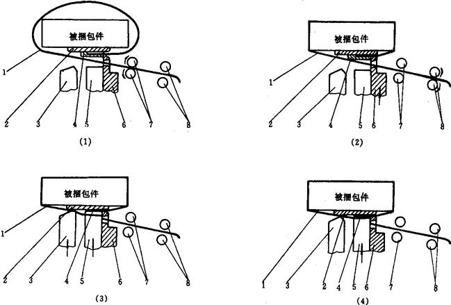 | 释义 | 机械式半自动捆扎机 机械式半自动捆扎机是以手工穿带,单次操作完成捆扎包件的机器,适用于各类纸箱、木箱、书报等包件的捆扎,也可捆扎筒状、环状的包件。 1 工作原理 与自动捆扎机不同的是半自动捆扎机在工作时,必须由手工穿带,而其余工作过程均与自动捆扎机相同,也由送带、拉紧、切烫、粘接四个环节组成。工作原理如图2-7-8所示。 1.1 送带〔图2-7-8(1)〕 为适应大小不同包件的捆扎要求,以时间继电器控制送带时间,达到调节送带长度以满足包件的捆扎需要。送带时,上下退带滚轮8分开,上下送带滚轮7分别作顺时针和逆时针转动,利用滚动摩擦夹带从中间穿过的捆扎带,使之向前送带,至选定的送带长度时停止。使机器处于待捆状态。 1.2 拉紧〔图2-7-8(2)〕 捆扎时将包件放置工作台上,用手将已送出的带头沿送带槽插入热合台2底面的凹槽内,使之触碰微动开关,使上下送带滚轮7脱开,而退带滚轮8上下压合,并使上下退带滚轮分别作逆、顺时针转动,依靠滚动摩擦力使捆扎带向下退出,并逐渐紧束包件。与此同时,在凸轮的控制下右爪6上升用爪尖将捆扎带顶压在热合台2的底面右凹槽内,使带子不致于全部被拉出。