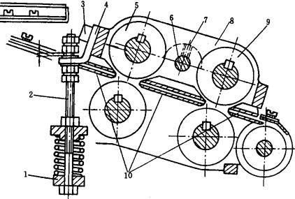 图2-7-9 送退带机构 1-螺杆弹簧座 2-螺杆 3-六角螺钉 4-拉紧器 5-送带滚轮 6-销轴 7-紧定螺钉 8-压带支架 9-退带滚轮 10-轨道 送退带机构主要完成捆扎带的自动送入和退出拉紧。有一组送带滚轮5和一组退带滚轮9来完成,按下送带按钮时,电磁铁吸合并拉下螺杆2使压带支架8绕销轴6摆动,此时送带滚轮5结合而退带滚轮9分开,上送带滚轮5跟随下送带轮转动,利用滚动摩擦将轨道10内的捆扎带向前送出一定长度。 当退带时,螺杆2被拉紧凸轮顶起,推动压带支架8绕销轴6摆动,这样送带轮滚5上下脱开而退带滚轮9压合,上退带轮相应跟随下退带轮(主动)分别作逆顺时针转动,夹紧捆扎带从轨道10中退出,使包件逐渐被拉紧至预定要求。 2.2 封缄机构(图2-7-10)