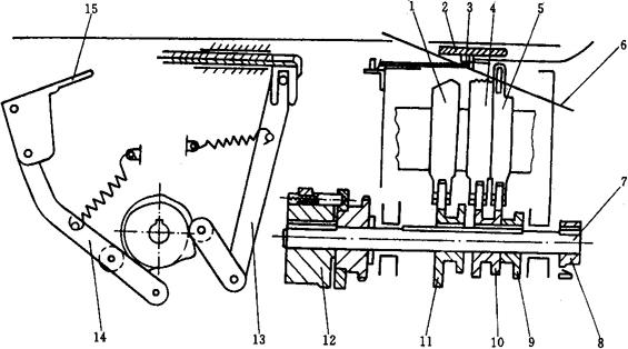 图2-7-10 封缄机构 1-左爪 2-热合台 3-开关板 4-压力柱 5-右爪 6-捆扎带 7-凸轮轴 8-拉紧凸轮 9-隔离器凸轮 10-压力柱、右爪凸轮 11-加热器、左爪凸轮 12-滑道盘 13-隔离器臂 14-加热器臂 15-烫头 封缄机构完成捆扎带的顶压、切断、加热、粘接等动作,利用凸轮轴上的6只凸轮分别控制左爪、烫头(加热器)、压力柱、右爪、隔离器、送带退带机构、热合台等动作,而凸轮轴的转动或停止则由另一组电磁铁的吸合或释放带动离合器来控制。 2.3 带盘制动机构(图2-7-11)