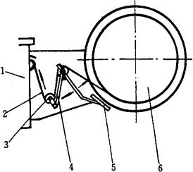 图2-7-11 带盘制动机构 1-捆扎机 2-捆扎带 3-滚轮 4-制动带 5-制动块 6-带盘 为了使捆扎带在工作过程中既能从带盘中流畅地拉出,又要防止由于转动惯性的作用过量地拉出,造成带卷杂乱无章,因此必须采用制动机构。当送带时,由于捆扎带的拉力作用,带动制动杆向上,使制动杆脱开带盘,捆扎带就能被拉出。当送带停止时,送带拉力消失,制动杆就在拉簧的作用下回复到原来位置,使制动块紧贴在带盘外圈起到制动作用。 3 分类(图2-7-12)