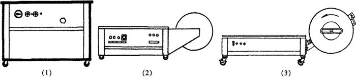 图2-7-12 半自动捆扎机分类 (1)高台型 (2)中台型 (3)低台型 半自动捆扎机几经改进,其内部结构、功能都已趋向一致。不同之处仅在于工作台面高低不同,以适应包件重量和工作位置的变化。为此,可分为: 3.1 高台型 工作台面高度在750~900mm之间,适宜于体积和重量都较大的包件捆扎,操作时以站立为宜。 3.2 中台型 工作台面高度在400~500mm之间,适宜于体积大而重量不大的包件捆扎,操作时可站立也可坐着工作。 3.3 低台型 工作台面高度在350mm以下,适宜于体积和重量都较小的包件捆扎。因工作台较低,操作时须坐着工作。 3.4 台式型 台式型也称桌上型,属于微型捆扎设备,可放在桌面上或支架上工作,采用带宽为5~6mm的捆扎带或弹性带。 4 技术参数 机械式半自动捆扎机主要技术参数包括: 4.1 捆扎尺寸 也分最大捆扎尺寸和最小捆扎尺寸。在半自动捆扎机上,由于没有轨道部件,因此最大包件尺寸就可不受限制,只要包件能在工作台上安放就可捆扎。包件捆扎最小尺寸也受热合台大小的限制,以稍大于热合台的宽度为宜。 4.2 每道捆扎时间 每完成捆扎包件一次,其捆扎全部动作所需的时间,各类半自动捆扎机的每道捆扎时间大体相同,一般为4~5s。 4.3 捆紧力 半自动捆扎机受结构的限制和使用要求的不同,其捆紧力要小于自动捆扎机,一般为400N。 4.4 工作台面高度 参见本节“3分类”。 4.5 功率 由于各类半自动捆扎机的结构大体相同,其消耗的功率均在700~800W。 5 运行调试 5.1 送带长度的调整 应根据被捆包件的周长,使选定的送带长度稍大于包件周长的200mm为宜。太短了不足以捆扎;太长了则会延长送带时间,也容易使捆扎带扭曲。调整时只需调整机器电气面板上的送带时间继电器旋钮,用改变送带时间来控制送带长度。 5.2 捆紧力的调整(图2-7-13)