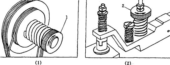 图2-7-13 捆紧力调整 1-离合器调节螺母 2-调节螺母 根据各种包件对捆紧力的不同需要,调节摩擦离合器端面的离合器调节螺母1,使压缩弹簧摩擦片的压力产生变化,以此改变传送到退带滚轮的传动力,使对捆扎带的拉力产生变化。或者调节螺母2,使上下退带滚轮的压合间隙产生变化,同样能达到改变拉紧力的目的。 5.3 捆扎带宽度的调整(图2-7-14)