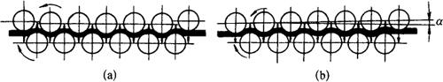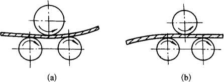 图8-40 滚板机工作示意图 (a)平行式;(b)不平行式 矫正时,为使板料受到足够的压力,进料口的上下轴辊垂直间隙应略小于板材的厚度。为使板材能够平直,此料口的上下轴辊间隙不得小于板材的厚度。 1)滚板机的工作原理 当不平的板料进入滚板机时,即受到上下两排交错排列的轴辊滚压,经过反复弯曲延展,板料原有的紧缩区域变为松弛,而原来的松弛区域虽然也得到延展,但比紧缩处的放松程度要少,从而调整了板材的松紧,使板材获得矫正。 2)矫正方法 矫正板材前,应查看其变形的情况,适当调整两排轴辊间隙,空转试车正常后,即可将板材输入轴辊之间进行平直。 有的板材在滚板机上往往一次难以矫平,而需要经过多次滚压。如经多次滚压后,仍达不到矫平时,可在工件变形的紧缩区域上面放置厚度为0.5~2mm的软钢板条(俗称加热)再滚,便可使工件的加热处获得较大的延展。去掉垫条后,再经滚压即可矫平。 在矫平厚钢板时,也会遇到局部严重凸起,难以直接输入滚板机进行矫平。为此,可先用火焰对严重凸起处进行局部加热修平,待基本修平后,再用滚板机进行矫正。如果钢板平直精度要求较高,在滚板机矫正之后仍达不到所要求的平直度,应采用手工矫正的方法进行精矫。 在没有薄板滚板机的情况下矫正薄板时,可在一般的滚板机上用大于工件幅面的厚钢板做垫,把薄板放在厚板上同时滚压。采用此方法时,要注意上下两排轴辊的间隙不宜太小,以免损坏设备,并且应在薄板变形区域的紧缩部位加放垫条,以利矫平。 较小规格的板材和未经煨曲成形的平板料,也可利用滚板机矫平。其方法是用大幅面的厚钢板做垫,把厚度相同的小块板料均匀地摆放在垫板上,同时滚压。如小块板料变形复杂时,待滚压一至两遍后,翻转工件再滚压。对于滚压后仍不能矫平的板料,需另进行手工矫正。使用滚板机时,要随时注意安全,严防手和工具被带进滚板机而造成人身和设备事故。另外,在滚板机矫平前和过程中,要将板面上的铁屑、杂物等清除干净,以免在滚压过程中,在板材表面压出压痕。 (2)滚圆机矫正板料 滚圆机主要是将板料卷曲为筒形零件的机械设备。在缺乏滚板机的情况下,利用滚圆机也可矫平板材。 1)厚板的矫正 先将板材放在上下轴辊之间滚出适当弧度,然后将板材翻转,调整上下轴辊距离,再滚压,使原有弧度反变形,几经反复滚压,即可矫平。如图8-41所示。
