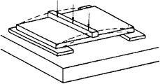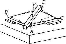 图8-43 厚钢板弯曲的矫正 1-压杠;2-工件垫;3-支撑 (d)表示厚板出现局部弯曲的矫正方法。 2)对厚板扭曲的矫正 首先判明扭曲的确切位置。凡钢板扭曲时,其特点均是一个对角附着于工作台上,而另一对角翘起。矫平时,同时垫起附着于工作台上的对角,在翘起的对角上放置压杆,操作方法与厚板弯曲的矫正相同。要注意的是,摆放在工件下面的支撑垫,应与工件上面的压杠相平行,距离大小应依据扭曲的程度而定,如图8-44所示。