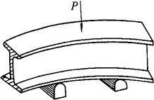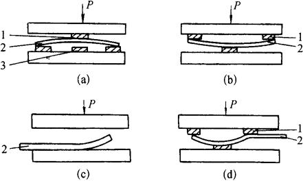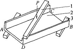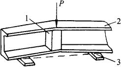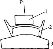 图8-48 槽钢对角翘起的压力矫正 1-压铁;2-工件;3-垫铁 ②槽钢立面弯曲的机械矫正:槽钢以立面弯为主,并使两翼板平面也随之弯曲的叫做立面弯曲。矫正立弯时,将槽钢凸起处置于压力机顶压中心,在平台与工件之间的凹处两侧放置垫铁(支撑)、在工件受压处的槽内放置相应的规铁,摆稳之后,在工件的凸起处施加压力,并使其略呈反变形,如图8-49所示,除去压力后反变形被回弹,从而得到矫正。