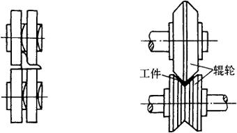 图8-53 工字钢翼板倾斜的机械矫正 1-工件;2-接杆;3-支撑 翼板向外倾斜时,可用压力机直接顶压倾斜处进行矫正。如果变形严重而不适于冷作矫正时,可在翼板与腹板相连的变形处用火焰加热,再施以机械压力矫正。 (4)圆钢的机械矫正 圆钢弯曲变形可用管子矫直机进行矫正。管子矫直机的关键部位是辊轮。辊轮成对排列,并与被矫直工件的轴线成一定角度。辊轮两头粗、中间细,矫正时,先调好辊轮的间隙,机器开动后,输入的圆钢与辊轮接触,在滚动压力的作用下,斜置成对的辊轮就迫使圆钢沿螺旋线滚动前进,圆钢经受几次辊轮的反复滚压,便使其弯曲部位获得矫直。 |