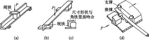 图8-46 在压力机上矫正角钢示意图 (a)角钢平面在下的压力矫正;(b)角钢平面在上的压力矫正;(c)规铁;(d)用顶床矫正角钢 ②用机械矫正角钢的两面垂直度时,常采用如图8-47所示的方法操作。