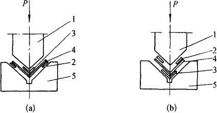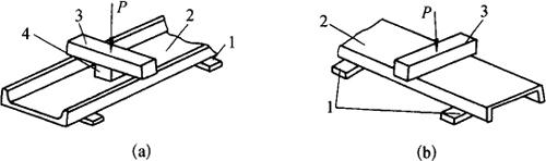 图8-47 角钢两面不垂直的压力矫正 (a)大于90°的矫正;(b)小于90°的矫正 1-上胎;2-垫板;3-规铁;4-工件;5-V形下胎 ③对工件变形的矫正,要视具体情况经过反复试验,以观察施加压力的大小、回弹情况等,然后再进行矫正。 (2)槽钢的机械矫正 1)用型钢矫正机矫正槽钢 使用型钢矫正机之前,应备好相应槽钢规格的辊轮,并装在型钢桥正机上,其操作方法与矫正角钢相同。 2)用压力机矫正槽钢 由于槽钢腹板的厚度较薄,且偏于小面的一侧,受力时容易变形,因此在机械矫正时,要在槽钢内的受力处加上相应形状的规铁。 ①槽钢对角上翘的机械矫正:在矫正槽钢对角上翘(或称之对角下落)时,应将接触平台的对角垫起,在向上翘的对角放置一根有足够刚性的压铁,再将机械压力施加在压铁中心位置上,使工件略呈反向翘曲,如图8-48所示。除去压力后,工件会有回弹,回弹量与反翘量相抵消,便可使槽钢获得矫正。回弹量的大小,要根据具体情况和实践经验来确定。如除去压力后仍有翘曲,或呈反向翘曲,要以同样的方法再进行矫正。