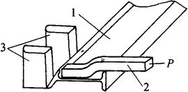图8-52 工字钢腹板弯曲的压力矫正 1-上垫铁;2-工件;3-下垫铁 3)工字钢翼板倾斜的矫正:工字钢翼板倾斜,有内向倾斜和外向倾斜两种。翼板向内倾斜时可采用图8-53所示的方法进行矫正。