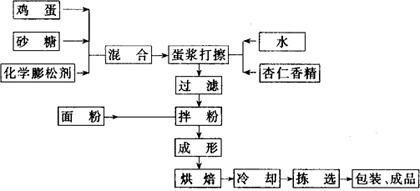 | 释义 | 杏元饼干(蛋黄酥) 杏元饼干是一种以面粉、砂糖粉和鸡蛋为主要原料的面制品。外形为冠形或双冠形,体积小,直径为22~25mm,内部结构呈多孔状,口感酥脆、香甜。 (一)原料的配比及配方实例 杏元饼干的基本原料配比一般以小麦粉为100计,砂糖粉60~80,鸡蛋30~40,杏元饼干要求使用弱力粉,如使用强力粉就必须配入较多的淀粉来降低面粉中的面筋含量,使之符合产品质量要求,面筋含量应控制在20%左右。此外,在配方中若增减鸡蛋用量,则应相应地改变膨松剂的用量,如在配方中降低鸡蛋的用量则应增加小苏打及(或)碳酸氢铵的用量,以提高疏松度。 杏元饼干配方(kg): 小麦粉(弱)92,淀粉8,砂糖粉68,鸡蛋36,饴糖8,小苏打0.35,香精油260mL,水43~52。 (二)杏元饼干生产工艺流程 杏元饼干的生产工艺流程见图2-1-7。