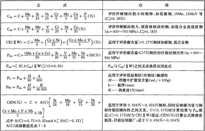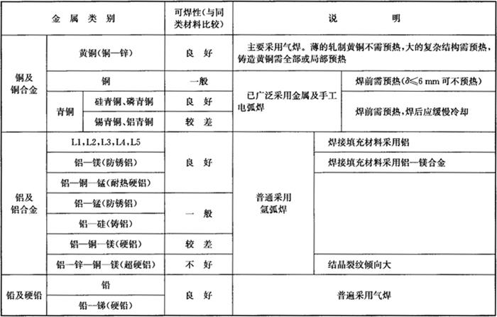 注:对于厚度不大的,C<0.6%;Mn<1.6%;Si<2.0%;Cr<1.0%;Mo≤0.6%的低合金钢按下式折算碳当量: 表7-10 有色金属的焊接性