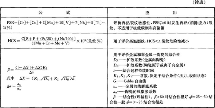 | 释义 | 材料的可焊性 在一定条件(工艺方法、工艺参数、结构形式)下,获得优质焊接接头的难易程度称为可焊性。对钢材、碳钢以碳含量,合金钢以碳含量或碳当量Ceq%(或CE%)来估算其可焊性。评价公式见表7-7,金属材料的可焊性见表7-9~表7-12。 表7-7 碳当量(CE)估算公式和裂纹敏感性评价公式