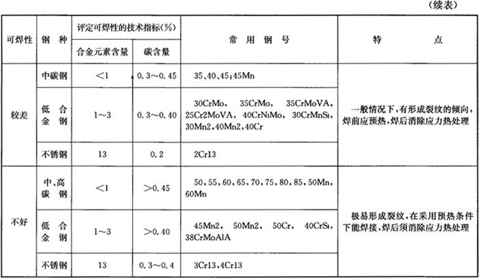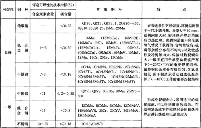 表7-9 常用钢材的焊接性