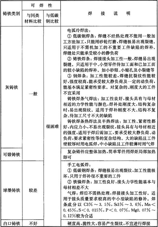表7-11 铸铁的焊接性