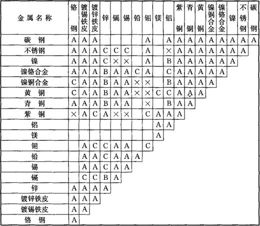 注:A——焊接性好;B——焊接性尚好,但焊缝脆弱;C——焊接性不好;×——不能焊接;空白——未经试焊。 |