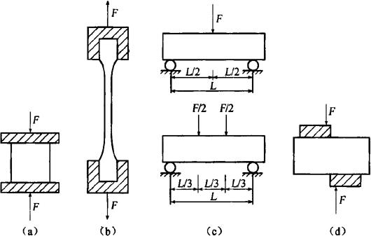 图2-2 材料受外力作用示意图 (a)压力;(b)拉力;(c)弯曲;(d)剪切 建筑装饰材料的抗压、抗拉和抗剪强度,可按下式计算: