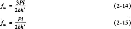 式中 f——材料的极限强度(抗压、抗拉、抗剪)(MPa); P——试件破坏时的最大荷载(N); A——试件的受力面积(mm2)。 建筑装饰材料的抗弯强度,与试件的受力情况、截面形状及支承条件有关。对于矩形截面的条形试件,当其两个支点的中间作用为一集中荷载时,其抗弯极限强度可按式(2-14)计算;当三分点加荷时,其抗弯极限强度可按式(2-15)计算: