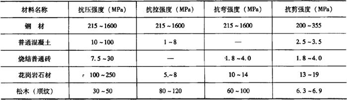 式中 fm——材料的抗弯极限强度(MPa); P——试件破坏时的最大荷载(N); l——试件两支点间的距离(mm); b、h——分别为试件截面的宽度和高度(mm)。 建筑装饰材料的强度大小,主要取决于建筑装饰材料的成分、结构及构造。种类不同的建筑装饰材料,其强度也不相同;即使是同一类建筑装饰材料,由于组成、结构和构造不同,其强度也有很大差异。材料的孔隙率愈大,则其强度愈小。对于同一品种的材料,其强度与孔隙率之间存在近似直线的反比关系。 一般情况下,材料的孔隙率越大,材料的强度越低。不同种类的材料具有不同的抵抗外力的特点,如砖、石材、混凝土等非匀质材料的抗压强度较高,而抗拉强度和抗折强度却很低,因此多用于房屋的墙体、基础等承受压力的部位;如钢材为匀质的晶体材料,其抗拉强度和抗压强度都很高,适用于承受各种外力的结构和构件。建筑工程中常用建筑材料的强度如表2-2所示。 表2-2 常用建筑材料的强度值