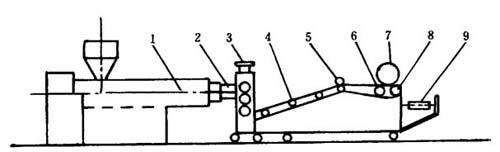 1-挤出成型机 2-机头 3-三辊机 4-冷却输送辊 5-切边装置 6-卷取装置的主动辊 7-成品 8-卷取装置的被动辊 9-卸放装置