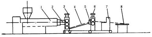 1挤出成型机 2-机头 3-三辊机 4-冷却输送辊 5-测厚仪,切边装置 6-两辊机 7-切断装置 8-成品和称重装置