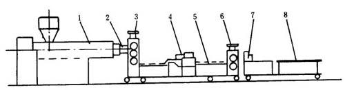 1-挤出成型机 2-机头 3-三辊机 4-波纹成型装置 5-冷却输送辊 6-两辊机 7-切断装置 8-成品和称重装置