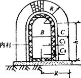 式中 C-烟道墙厚; h-烟道墙高; R-烟道拱半径; l-烟道长: V-烟道砌体。 烟道长度以炉体第一道闸门至烟囱外皮与烟道连接处计算。 ⑥烟道内衬 不能与烟囱内衬混用,按用料分别项目,工程量按实体积计算(见图2-49)。 其工程量计算公式为: