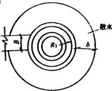 图2-50 S=(R1+b)2π-R12π-b×B(m2) 式中 S-散水面积; R1-烟囱底外半径; b-散水宽; B-烟道宽。 ⑧水塔基础 其工程量按实体积计算,分别钢筋混凝土、砖、毛石基础等。水塔基础多为钢筋混凝土基础,呈环形台阶式,计算工程量时,应将多层圆环的体积相加(见图2-51)。每层圆环体积计算公式为: