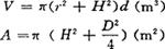 图2-53 锥形或球形塔顶及槽底的面积体积计算式: 锥形体积、面积计算式: V=π·r·κ·d(m3) A=π·r·κ(m2) 球形体积、面积计算式