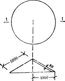 式中 r-底面积半径; k-圆锥斜长; d-壁厚;球形矢高。 〔计算例1〕 水塔圆锥封顶厚度0.08米,已知底面半径4米,圆锥长5米,求圆锥封顶体积(如图2-54)。