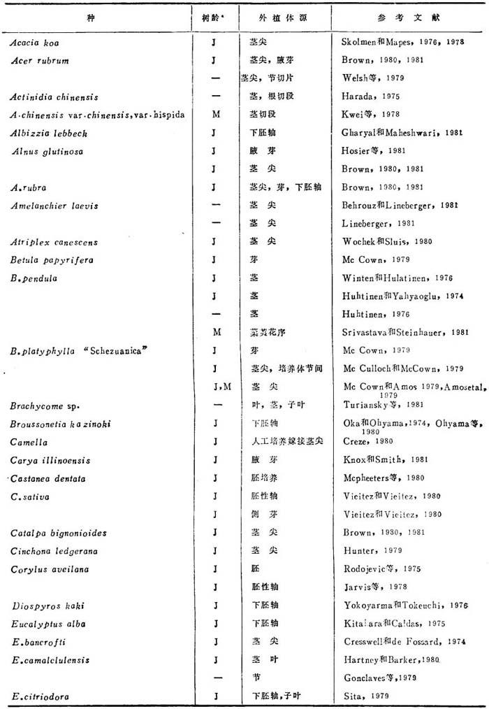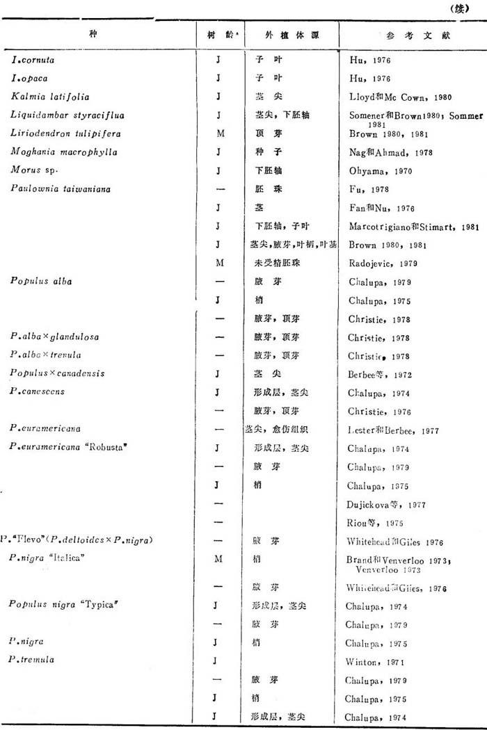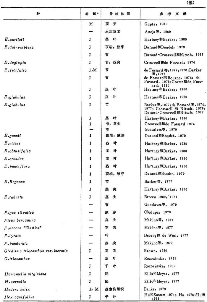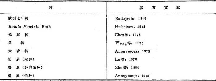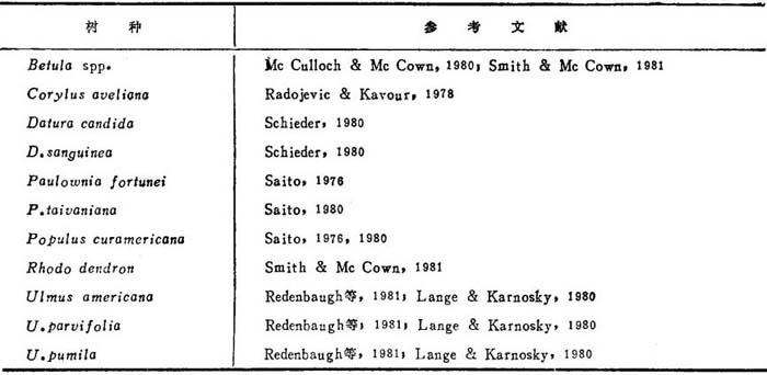 由于愈伤组织可能产生嵌合植株,着眼于小孢子直接雄核发育。值得注意有2个报告:Radojevic(1978)用欧洲七叶树花药培养,借助于光学和电镜,证实了再生植株和胚状体是来自小孢子。中期核型是单倍体。后来(1980)发表了发育中胚的超显微结构研究。还从Chimonanthus praecox取得花粉再生植株。橡胶树小孢子直接雄核发育也已成功。 3.原生质体 表25-3列出硬木种原生质体培养,大都用叶肉为供试源。Wakasa(1973)能从Prunus叶分离原生质体。Saito(1976)报道泡桐和Populus euramericana叶取得高产原生质体。Saito(1980)用PEG取得不同品系的泡桐属和杨属与泡桐的1∶1融合。Reden-baugh等(1980,1981)用榆花药培养的广泛研究,包括从花粉母细胞、四分体和小孢子分离原生质体,以产生榆树杂种。配子体原生质体不再生细胞壁,榆体细胞原生质体不产生细胞壁。曼陀罗属(草本种)与树木种融合再生杂种植株是迄今报道的唯一例证。 表25-3 树木原生质体培养文献