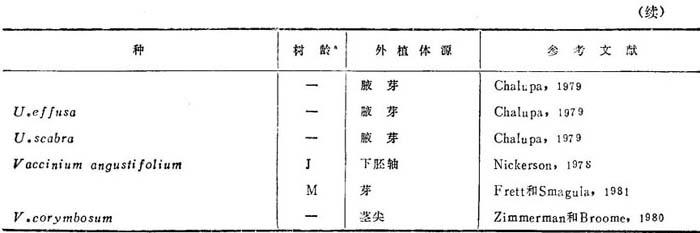 a.M=成年;J=幼年。 (二)培养程序 1.胚胎发生 组织培养产生体细胞胚比器官发生在繁殖实践上有几种优点。常能控制悬浮培养物的生长、繁殖和分化。或将悬浮物植板,在琼脂上完成分化。无论用什么方法,悬浮培养能从母株培养物快速繁殖,节省分株繁殖之劳,由于每瓶有产生上千再生植株的潜力。还可设想胚能加以包埋,当作种子处理。Haecius(1978)提出胚(合子或非合子的)的定义:从单个细胞产生的新个体,与母体组织无维管束相连接。单个细胞的来源难于证实。但是胚的解剖特征是存在着分开的根状的末端(维管束状密接亲体组织),不难区别。还有胚的生长而形成功能的再生植株。 Rao(1965)最早报道用檀香培养产生胚胎发生。胚易于同亲体分开。胚具有易识别的根,但胚性茎叶发育很差。未能得到功能性植株。 Hu等(1972)报道枸骨叶冬青子叶上产生体细胞胚条件不同寻常,合子胚子叶上发育的胚,培养在LS基础培养基上,未能长成茎叶和正常子叶。愈伤组织形成不明显。解剖研究指出与亲本组织无维管束连接。胚解剖特征正常,在特定条件下,能以发芽。Hu等(1978)指出有些胚是双色的,相当于背景子叶组织的双色部分。这就提出胚可能不是单细胞起源的。 另一种很有价值的木本植物非合子胚胎发生研究。早期报道采用光学和扫描电镜,这些研究透射电镜。Carylus auenlana和日本泡桐从合子胚取得了胚性愈伤组织或从日本泡桐的未成熟胚珠诱导产生。加2,4一D时再生植株形成受抑制,C.avenlana比日本泡桐更为强烈。在透射电镜研究中,他们发现二个种的胚性组织内有有规律排列的膜结合核糖体。这类排在植物细胞内很少报道。从已报告过的情况看,即羊齿卵受精后和活跃分泌腺,它与这些细胞重组织的生长模式或高合成能力相关联。 再生植株没有发现这些内质网(ER)模式,但组织化学研究,指出这些可能分化胚状体的分生组织细胞,能连续合成淀粉,富含糖类、脂质和蛋白质。有可能这些有规律的内质网排列与细胞的胚胎发生的感受性相关连。 体细胞胚胎发生的全部问题并未阐明。洋长春藤幼年和成年类型都在培养下生长。培养物暗培3个月,然后转入光培。幼年愈伤组织形成了茎叶,而老年愈伤组织在White培养基上,加活性炭,形成了胚。老年愈伤组织在不加活性炭培养基上,不分化。发育产生的再生植株表现幼年特性。 2.花药培养 多年来硬木种花药培养未获成功。表25-2列出少数报道,如Zenkteler等(1975)诱导产生单倍体愈伤组织,其他学者如Sato(1974)报道从花药培养体愈伤组织分化产生再生植株。它们证明是二倍体。1975年以来,发表了白杨花药培养产生单倍体。黑龙江森林研究所(1975)报道大青杨和小叶杨×黑杨的单倍体再生植株。Wang等(1975)报道黑杨花药培养体产生的单倍体。前者从愈伤组织取得。用杂种材料,33.8%愈伤组织是从花粉产生的。6再生植株的染色体数检查结果是单倍体。Zhu等(1980)培养杨属14个种,取得了400再生植株,大都是单倍体。 表25-2 花药培养产生再生植株的木本双子叶树木种