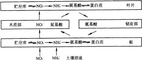 | 释义 | 果树体内矿质养分的循环与再利用 果树体内在韧皮部中移动性较强的矿质养分,从根的木质部中运输到地上部后,又有一部分通过韧皮部再运回到根中,而后再转入木质部继续向上运输,从而形成养分自根至地上部之间的循环流动。树体内养分的循环是果树正常生长发育所不可缺少的一种生命活动。氮和钾的循环最为典型(图2-13)。当果树根系从土壤中吸收的是硝态氮