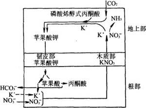 图2-13 植物体内氮的循环模式 (引自《植物营养学原理》) 钾也是果树体内循环量最大的元素之一。它的循环对树体内电性的平衡和节省能量起着重要的作用(图2-14)。根系吸收的K+在木质部中作为NO3-的陪伴离子向地上部运输,到达地上部后NO3-还原成NH3,为维持电性平衡,地上部有机酸(主要是苹果酸)与K+形成有机酸盐。有机酸钾盐可在韧皮部中运往根中。在根中有机酸钾再解离为K+和有机酸,有机酸可作为碳源构成根的结构物质或转化成HCO3-分泌到根外。在根中的K+又可再次陪伴NO3-向地上运输,如此循环往复。