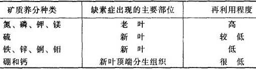 图2-14 硝酸与苹果酸的运输与地上、地下部之间钾循环模式 果树体内养分的循环还对根吸收养分的速率具有调控作用。 果树体内有些矿质元素能够被再利用,而另一些养分不能被再度利用。在韧皮部中移动性大的营养元素,如氮、磷、钾等,称为可再利用的养分;在韧皮部中移动性小的营养元素,如钙、硼、铁等,称为不可再利用的养分。 养分再利用的过程是漫长的,需经历共质体(老器官细胞内激活)→质外体(装入韧皮部之前)→共质体(韧皮部)→质外体(卸入新器官之前)→共质体(新器官细胞内)等诸多步骤和途径。因此,只有移动能力强的养分元素才能被再利用。 在果树的生长发育过程中,生长介质的养分供应常出现持久性或暂时性的不足,造成树体内的营养不良。为维持果树的生长,养分从老器官向新生器官的转移是十分必要的。然而果树体内不同养分再利用程度各不相同。再利用程度大的营养元素,缺素症首先出现在老的部位,而不能再利用的营养元素,缺素症首先表现在幼嫩器官(表2-5)。氮、磷、钾和镁4种养分在树体内的移动性大,因而再利用程度高,当这些养分缺乏时,可从老的部位迅速及时地转移到新生器官,以保证幼嫩器官的正常生长。铁、锰、锌和铜等微量营养元素在韧皮部移动性较差,再利用程度较低。因此,缺素症首先出现在幼嫩器官。但老叶中的这些微量元素通过韧皮部向新叶转移的比例及数量还取决于体内可溶性有机化合物的水平。当能够螯合金属微量元素的有成分含量增高时,这些微量元素的移动性随之增大,因而老叶中微量元素向幼叶中的转移量随之增加。在果树生产中养分的再利用程度是影响果实产量与品质、肥料利用率高低的重要因素,通过各种有效的农艺措施,以提高树体内养分的再利用效率,就能使有限的养分物质发挥其更大的增产作用。 表2-5 缺素症状表现部位与养分再利用程度之间的关系