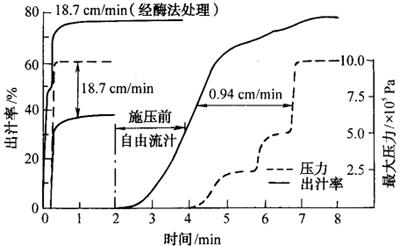 图2-1-5 压榨力和压榨速度对出汁率的影响 (1)对果蔬浆进行酶处理,用果胶酶降低果蔬浆的黏度,可以缩短挤压时间,提高出汁率。由图2-1-6可见,经过酶处理的苹果浆,出汁率明显提高。