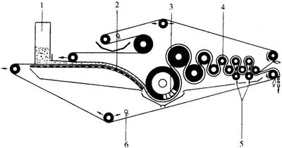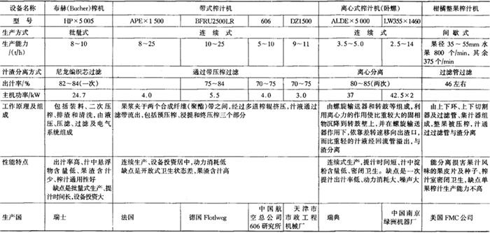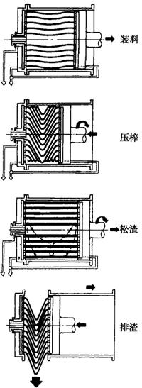 图2-1-6 液压式榨汁机榨汁过程 (2)使用压榨助剂压榨助剂有硅藻土、稻糠,木纤维等,将这些压榨助剂选择性地加入果蔬浆中,可以适当提高压榨时的挤压力,缩短压榨时间。压榨助剂使用量一般为0.5%~1.0%。 2.果蔬破碎程度 果蔬出汁率与原料的破碎程度有关,因此果蔬原料提汁前必须先行破碎,用以破坏果蔬组织的细胞,使细胞中的汁液容易流出,并在挤压过程中形成一个有利于排汁的通道,才能获得满意的出汁率。但如果破碎过度,果蔬汁液的毛细管通道被破坏,反而不利出汁。因此果蔬的破碎一定要适当。果蔬的破碎度参见破碎一节内容,具体要根据压缩机和生产经验决定。 3.挤压料层厚度 果蔬浆渣的挤压料层厚度越大,汁液从果浆内部流至出汁口的距离就越长,出汁阻力大,排汁时间也长。换言之,如果其他挤压条件相同,则在某一挤压时间内,挤压料层厚度越大,出汁就越少,出汁率就会因此而降低。而且挤压料层厚度大时,若要获得相同的挤压效果势必要提高压榨力,这样又会破坏挤压的最佳状态。为此在保证生产能力和经济性的原则下尽可能减少料层厚度,以缩短排汁通道。 利用压榨方法取汁的榨汁机类型很多,主要有液压式榨汁机、连续带式榨汁机、卧式螺旋沉降离心机(卧螺)、螺旋榨汁机、柑橘全果榨汁机(In-line juice extractor)、充气板框压榨机、裹包式榨汁机和切半锥式机等。可根据果蔬原料、榨汁方式和生产量进行选择,常用榨汁机工作原理及性能见表2-1-37。仁果类水果常用的榨汁机是液压式(布赫)榨汁机和带式榨汁机。工作原理分别见图2-1-6和图2-1-7。 表2-1-37 主要榨汁机