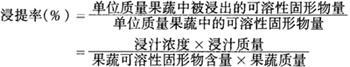 式中 c——山楂果周围汁的平均浓度 c0——山楂果中的可溶性固形物含量 c0 c——平均浓度差,随着浸提的进行,c的数值逐渐增大,且与c0的差值逐渐减少 d——山楂果的平均直径 T——平均热力学温度 η——平均热力学温度下扩散时浸汁的黏度 F——山楂果的总表面积 t——浸提时间,从山楂果放入水中至果渣离开浸汁时的整个浸提时间 浸提效果具体表现在从果蔬中浸提出的可溶性固形物量,即出汁量和汁中的可溶性固形物的含量(折光度)两个指标。在此通常用浸提率表示浸提效果。浸提率就是单位质量的果蔬原料被浸出的可溶性固形物量与单位质量果蔬原料中所含可溶性固形物的比值,用公式表示即: