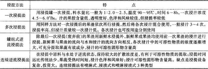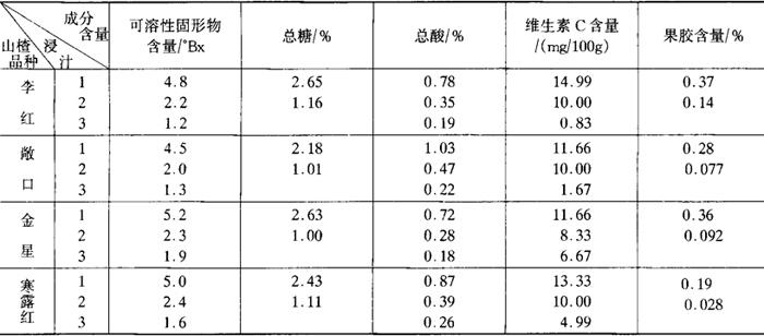 用不同品种的山楂进行3次浸提,各次浸汁成分见表2-1-39。由表可见1次浸汁可溶性固形物含量高,浸汁质量好,试验表明,一次浸提的有效成分仅为3次浸提总提取量的50%~60%,因此多次浸提有利于有效成分的充分提取。 表2-1-39 不同品种山楂三次浸提的浸汁成分含量