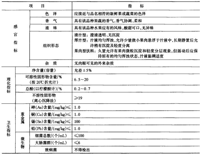 果蔬汁饮料的质量标准包括感官、理化和卫生三方面的指标。感官指标包括色泽、滋味、气味、组织形态等。理化指标包括净重、可溶性固形物含量、含酸量、不溶性固形物含量等。营养成分指标主要有维生素C、氨态氮及灰分的含量等。卫生指标主要是重金属含量和微生物指标,重金属指砷、铜、锡、铅等。对果蔬汁及饮料来说,微生物指标目前可采用两种标准,一种是细菌总数和大肠杆菌的数目应符合规定要求,同时,不得检出致病菌。另一种是按商业无菌标准,规定不得有致病菌及因微生物作用所引起的腐败特征。