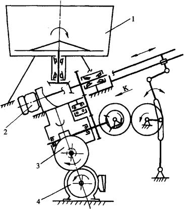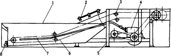 图1-6-17 水果淋洗机 1-进料斗 2-滚动输送机构 3-喷淋系统 4-出料斗 5-传动机构 清洗后的果蔬经过熏硫及浸硫处理后需经淋洗机进行再清洗,使表面残留物除掉。另外,淋洗机也可清洗汁多、皮薄的水果。该机工作时原料由进料斗1进入滚动输送机构2中。滚动输送机构是由多个倒锥串滚组成,倒锥串滚固定在输送链条上,可随输送链条前进,物料进入输送机构中可实现两种运动,既自身翻滚又可随输送机构向前运动。这样,在喷淋系统喷淋水的喷刷下,将原料表面残余物质清洗干净,从出料斗4送出。 3.3 切条机(图1-6-18)