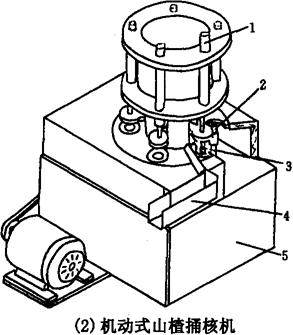 图1-6-18 切条机工作原理图 1-片厚调节机构 2-导向压板 3-物料片 4-切条刀 5-切条刀回转滚 6-物料条 7-切片回转腔 8-切片刀 9-物料 10-推料叶片 切条机工作时,物料以一定的数量送入喂料斗后进入高速旋转的切片回转腔7,由于离心力的作用,物料紧靠回转壁,在推料叶片10和切片刀8的共同作用下完成切片过程。切出的料片又以一定速度在导向压板2的辅助作用下,向高速旋转的切条刀4喂入完成切条工序。通过调整片厚调节机构、切条刀数和切条刀回转速度可以改变料条截面尺寸。 3.4 山楂捅核机(图1-6-19) 图1-6-19所示为目前广泛使用的两种山楂捅核机。 图1-6-19(1)所示为脚踏式捅核机。该机有2把上刀1和2把下刀2。工作时脚踩踏板5,通过拉杆4带动上刀1切入山楂,并直接将果核经下刀2的内孔捅出。 图1-6-19(2)所示为多刀捅核机。它由16把上刀1和16把下刀2、果模,以及链传动、齿轮传动和凸轮传动等机构组成。果模有分离式和组合式两种,前者靠人工周转,后者由链传动自动周转。工作时要靠人工把山楂放入果模中。当果模进到工作位置后,捅核机的上、下刀几乎同时切入果肉中,下刀在山楂花萼处切入一定深度后,即自行下落,上刀则继续下行,直至把果核捅出。
