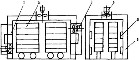 图1-6-23 烘房示意图 1-热风道 2-小车及托盘 3-循环风机 4-排潮风机 5-散热器 6-墙体 |