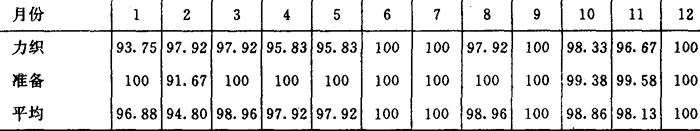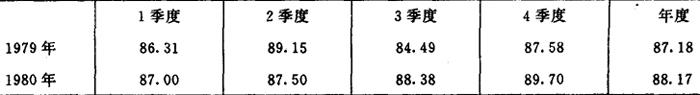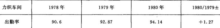 说明:1980年出勤率比1979年提高1.27%。力织挡车工全年满出勤的人数1979年为3人,1980年为18人。四三制有利于工人保护体力,消除疲劳。